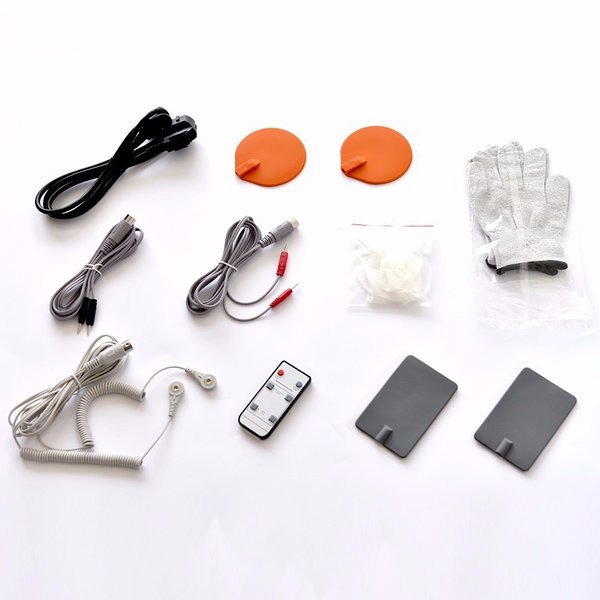 Komplekt: massaaži aparaat, spetsiaalseid sõrmikud, jäigad katteplaadid, painduvad isekleepuvad katteplaadid, pult.